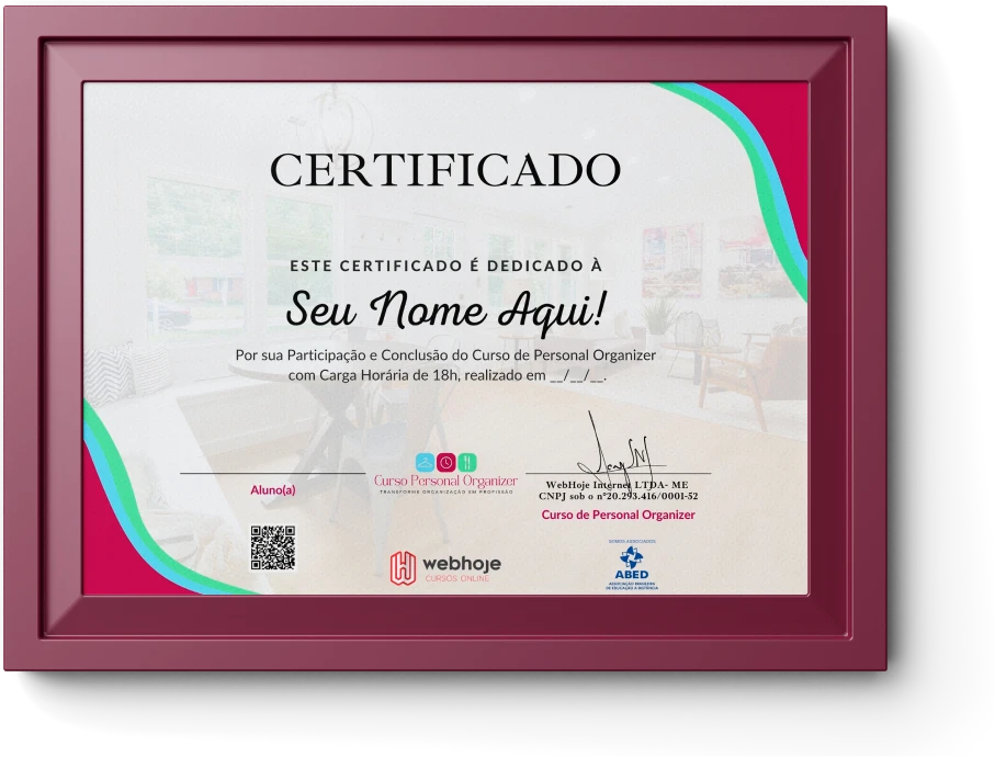 Ao finalizar o curso de Personal Organizer, você irá baixar um lindo certificado de conclusão válido em todo o território nacional. Este certificado não só comprova a sua dedicação e empenho, mas também valoriza o conhecimento adquirido, proporcionando uma prova concreta de sua qualificação.